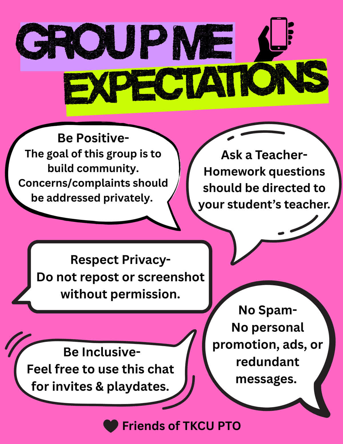 TKCU parents utilize GroupMe chats to stay connected and informed within each group. Topics may include group hangouts, events, etc. Make sure you join your child’s chat so you stay in the loop this year! If you need to know something, this is where you will go.
